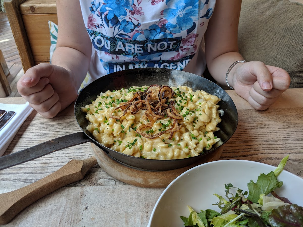 The menu focuses on classic Austrian comfort food, and a few standout dishes immediately catch attention. One of the most memorable plates here is the Kaiserschmarrn. Light, fluffy, and slightly caramelized, this traditional shredded pancake arrives warm and inviting. It’s the kind of dish that feels both indulgent and nostalgic at the same time, perfect for sharing after a hike or enjoying slowly with a cup of coffee.