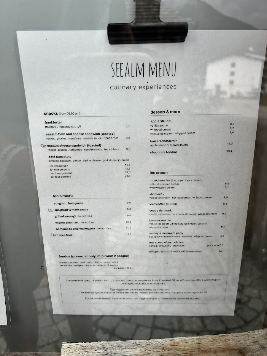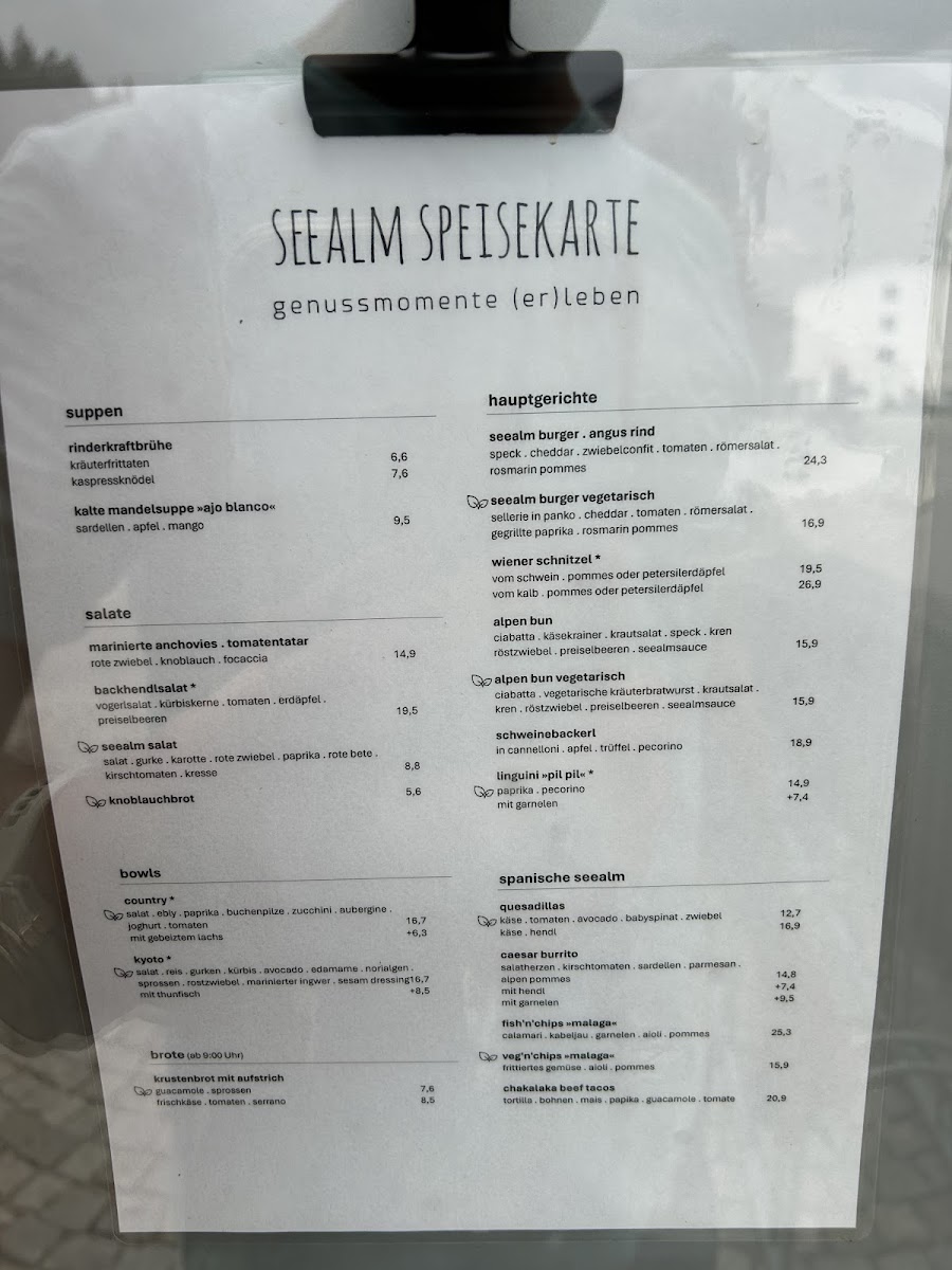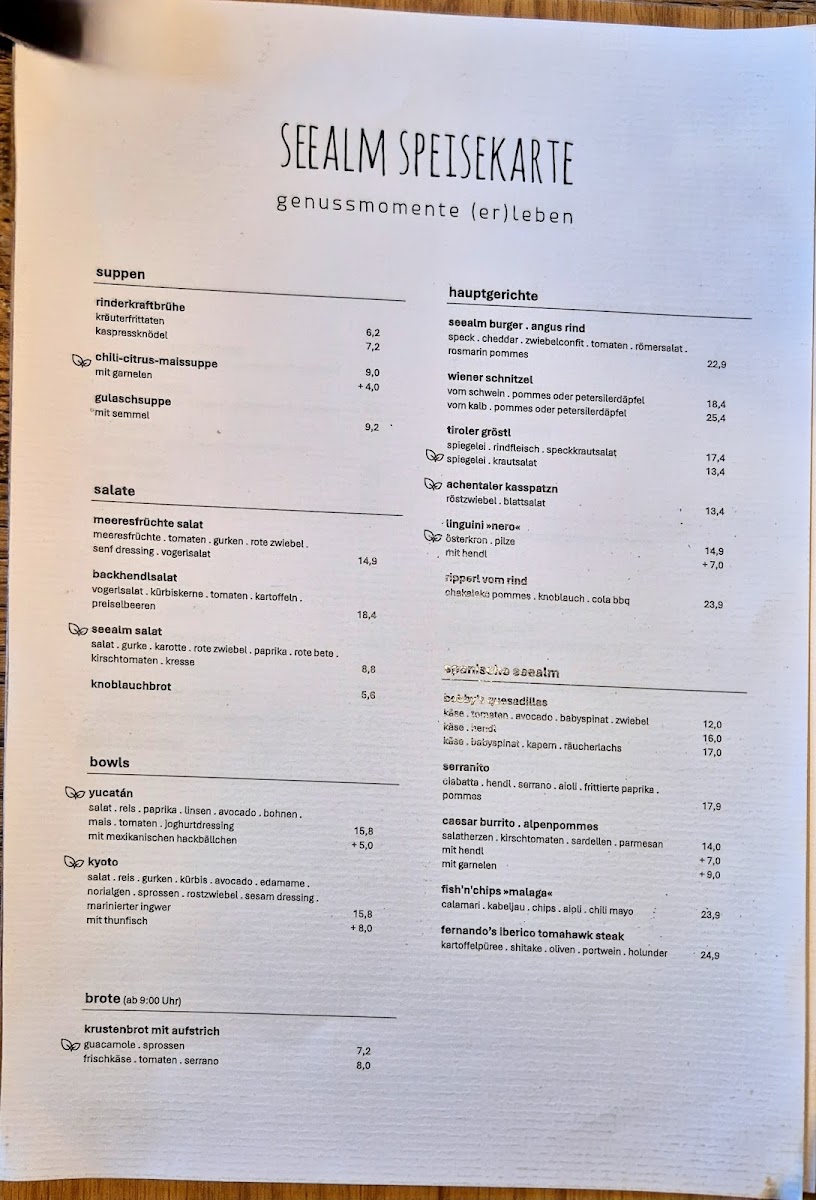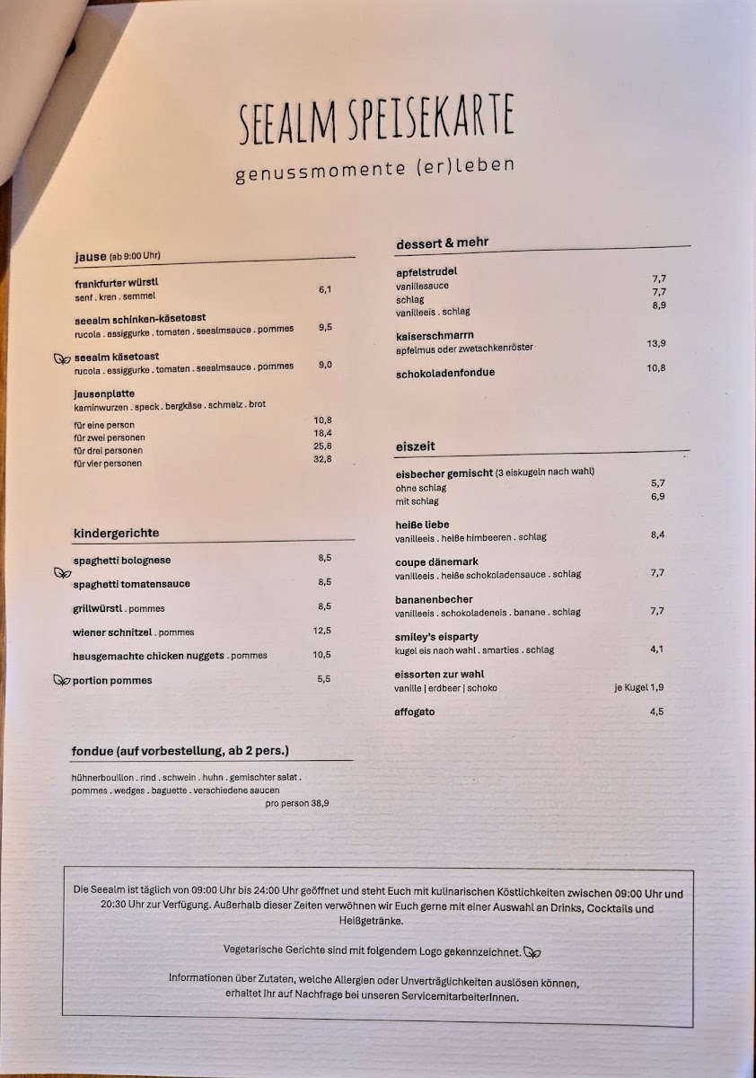 The menu at Seealm Am Kleinen Achensee is a delightful reflection of classic Austrian comfort food, with a focus on hearty and satisfying dishes. The standout dish is the Kaiserschmarrn, a sweet, fluffy shredded pancake often served with fruit compote, offering a perfect balance of sweetness and texture. For those craving a more savory experience, the Wiener Schnitzel Kalb is a must-try-tender veal coated in a crispy golden crust, served with traditional accompaniments like potato salad or lingonberry jam. Another menu highlight is the Forelle Fish N Chips, which features fresh, perfectly battered trout paired with crispy fries, offering a modern twist on a classic British favorite. With these dishes, Seealm Am Kleinen Achensee effortlessly combines regional flavors with international influences, making it a great destination for both locals and tourists seeking authentic, comforting meals in a picturesque setting.